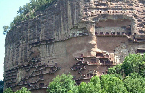 麦积山石窟为中国四大石窟之一,其它三窟为:龙门石窟、云冈石窟和敦煌莫高窟。麦积山石窟属全国重点文物保护单位,也是闻名世界的艺术宝库。 麦积山位于甘肃省天水市东南约35公里处,是我国秦岭山脉西端小陇山中的一座奇峰,海拔1742米,但山高离地面只有142米,山的形状奇特,孤峰突起,犹如麦垛,因此人们称之为麦积山。